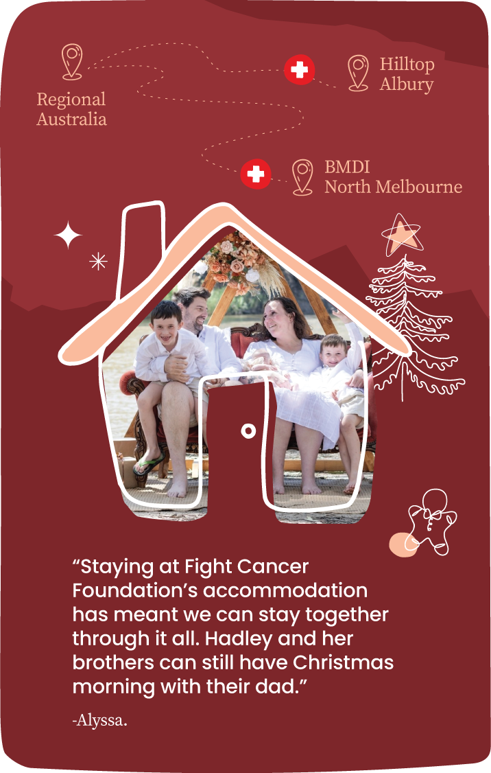 Your donation will help give families travelling long distances for cancer treatment a safe and welcoming place to stay at our accommodation centres, Hilltop (Albury) and BMDI (North Melbourne), just steps away from major hospitals, and together for Christmas morning